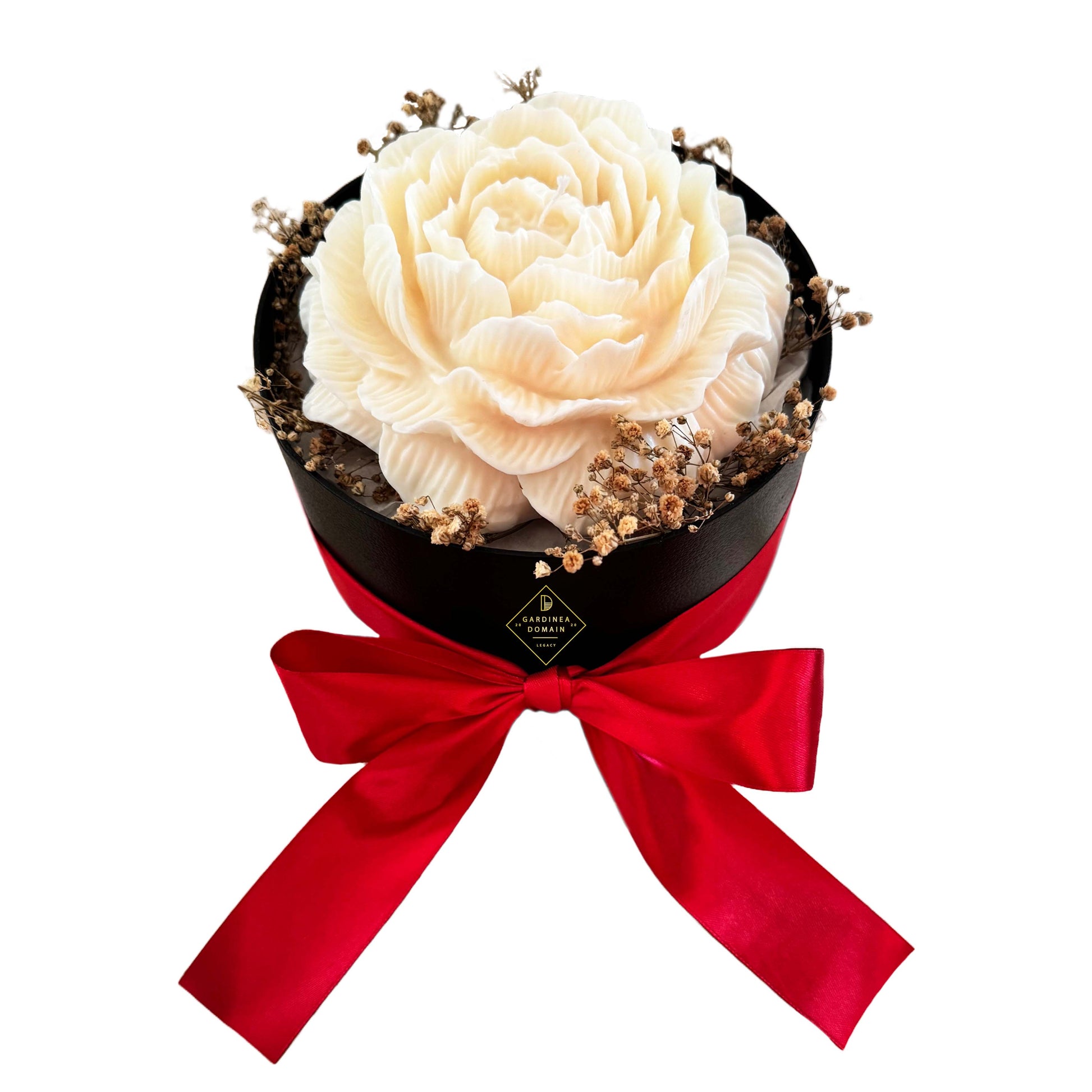 Aranjament floral 7 flori de bujor XL alb Gardinea Domain® din ceara naturala 100% soia si flori naturale stabilizate, aromaterapie, in cutie neagra